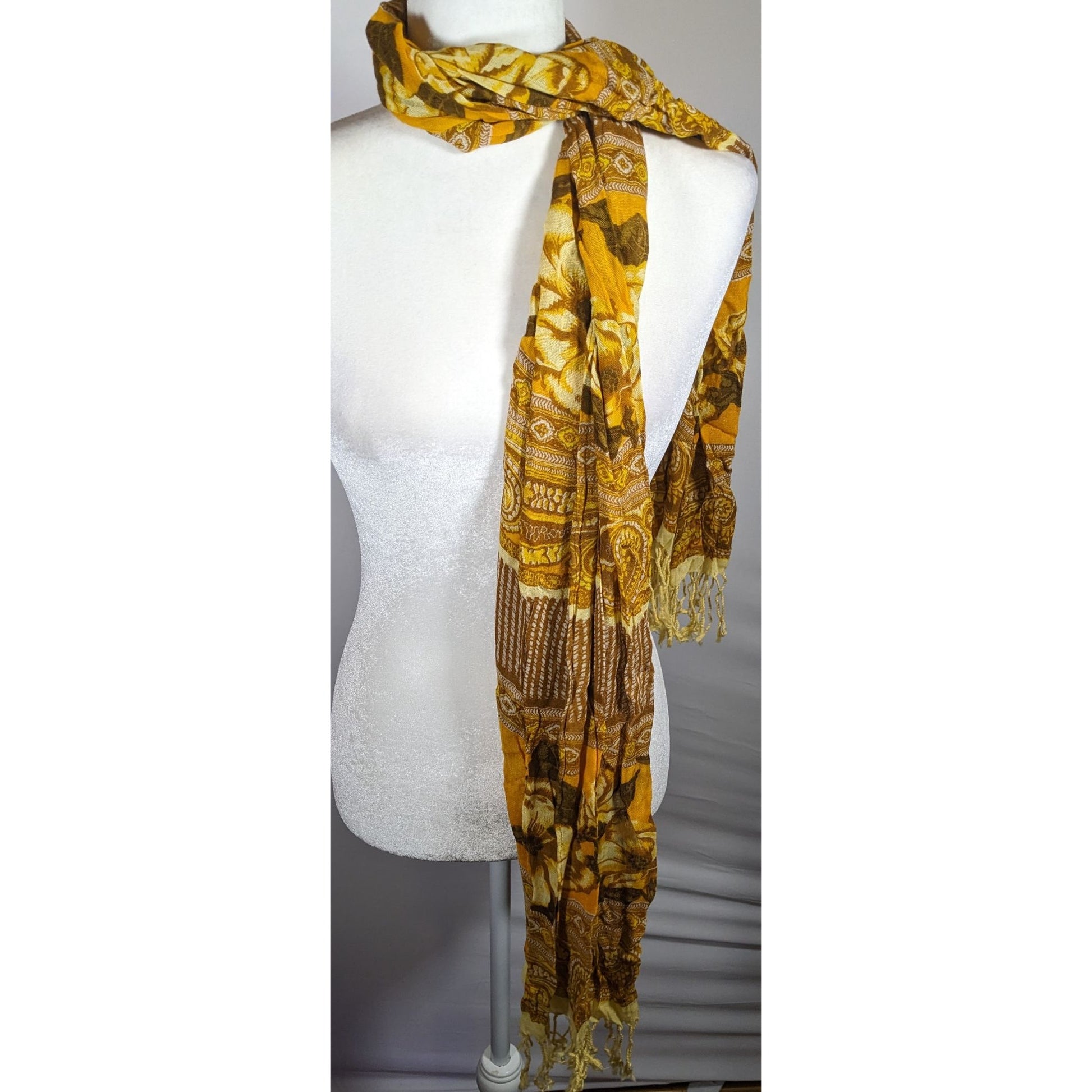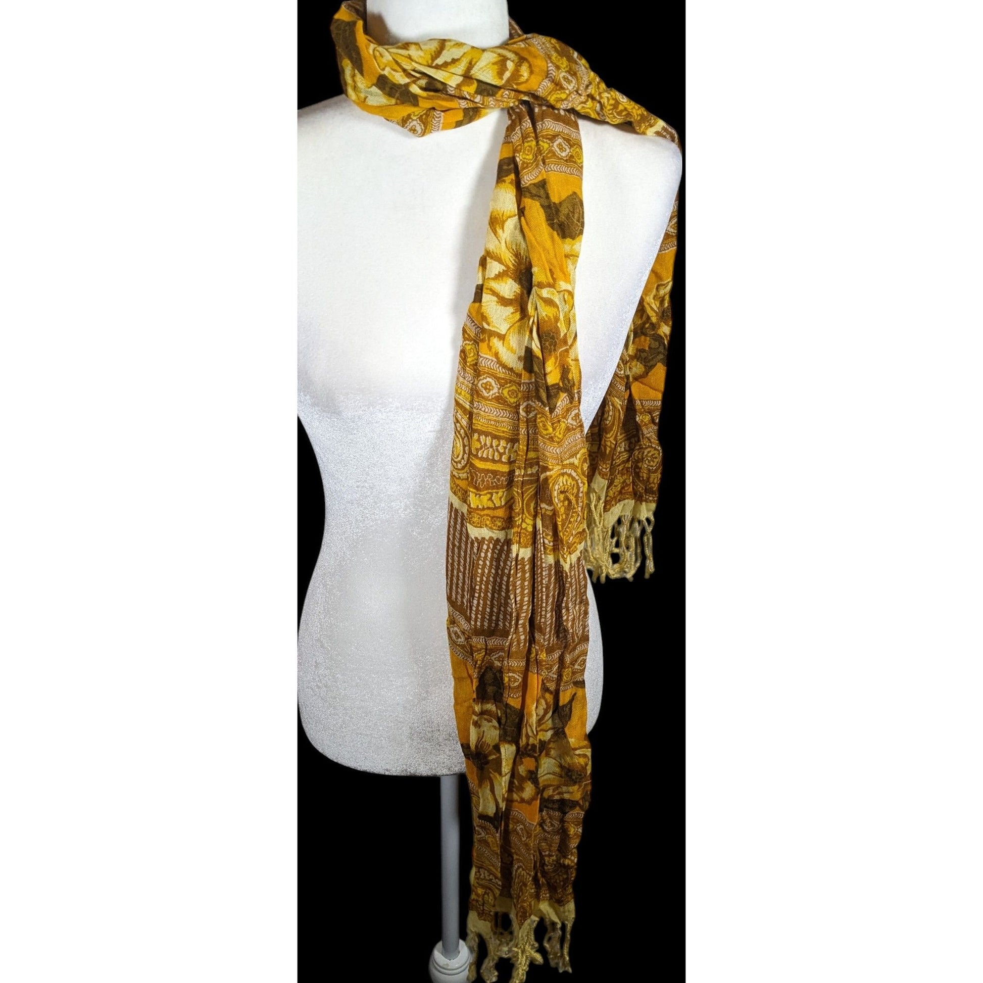 Elevate your style with this vintage Isaac Mizrahi scarf, featuring a vibrant yellow and brown floral paisley pattern. Finished with fringe detailing, this accessory adds a touch of elegance to any outfit.