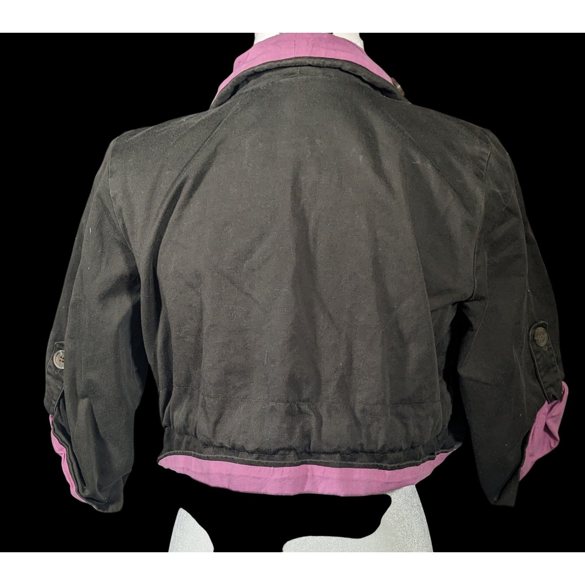 Embrace vintage flair with this cropped pink and grey button jacket. Perfect for a stylish outing, its medium size ensures a snug fit while adding a touch of elegance to any outfit.