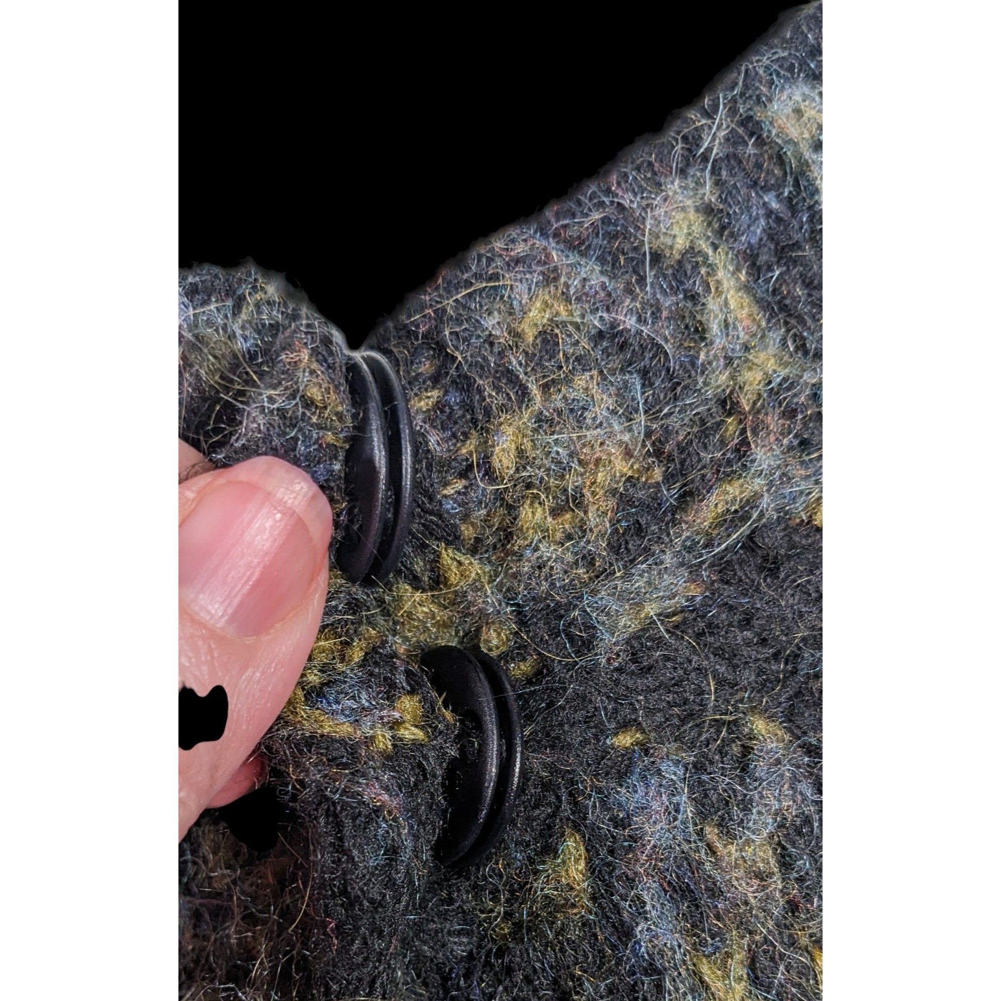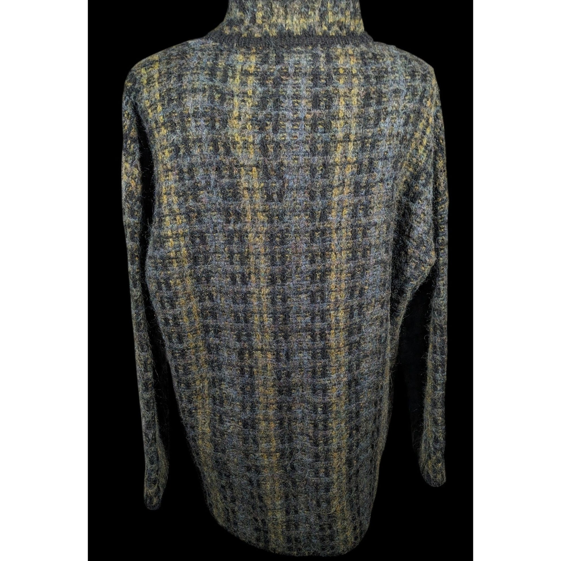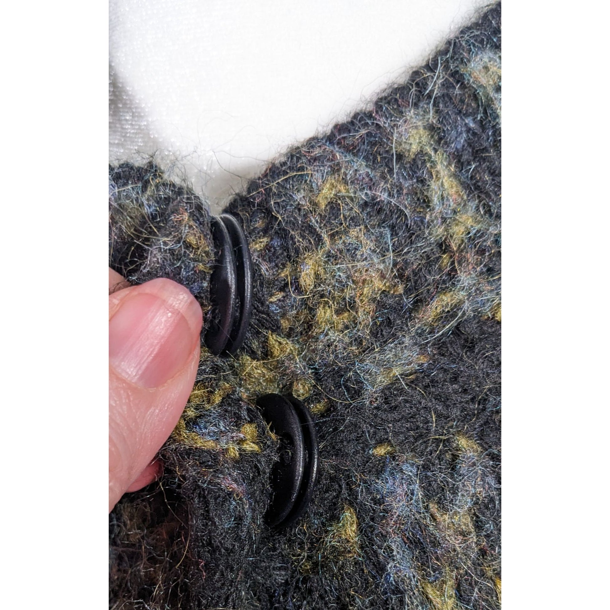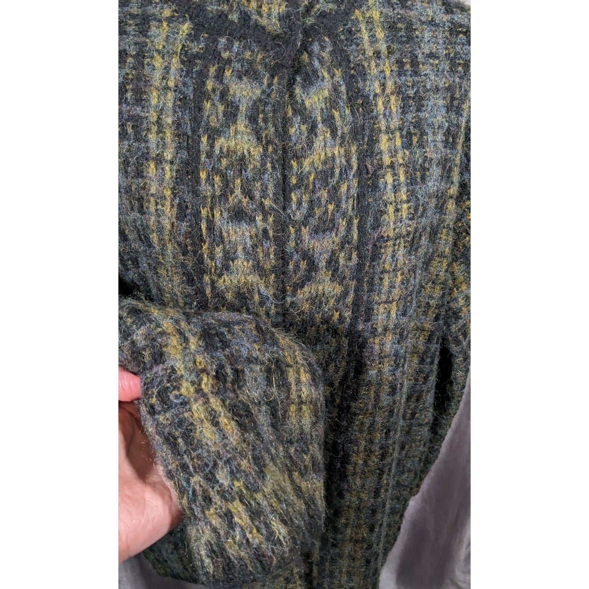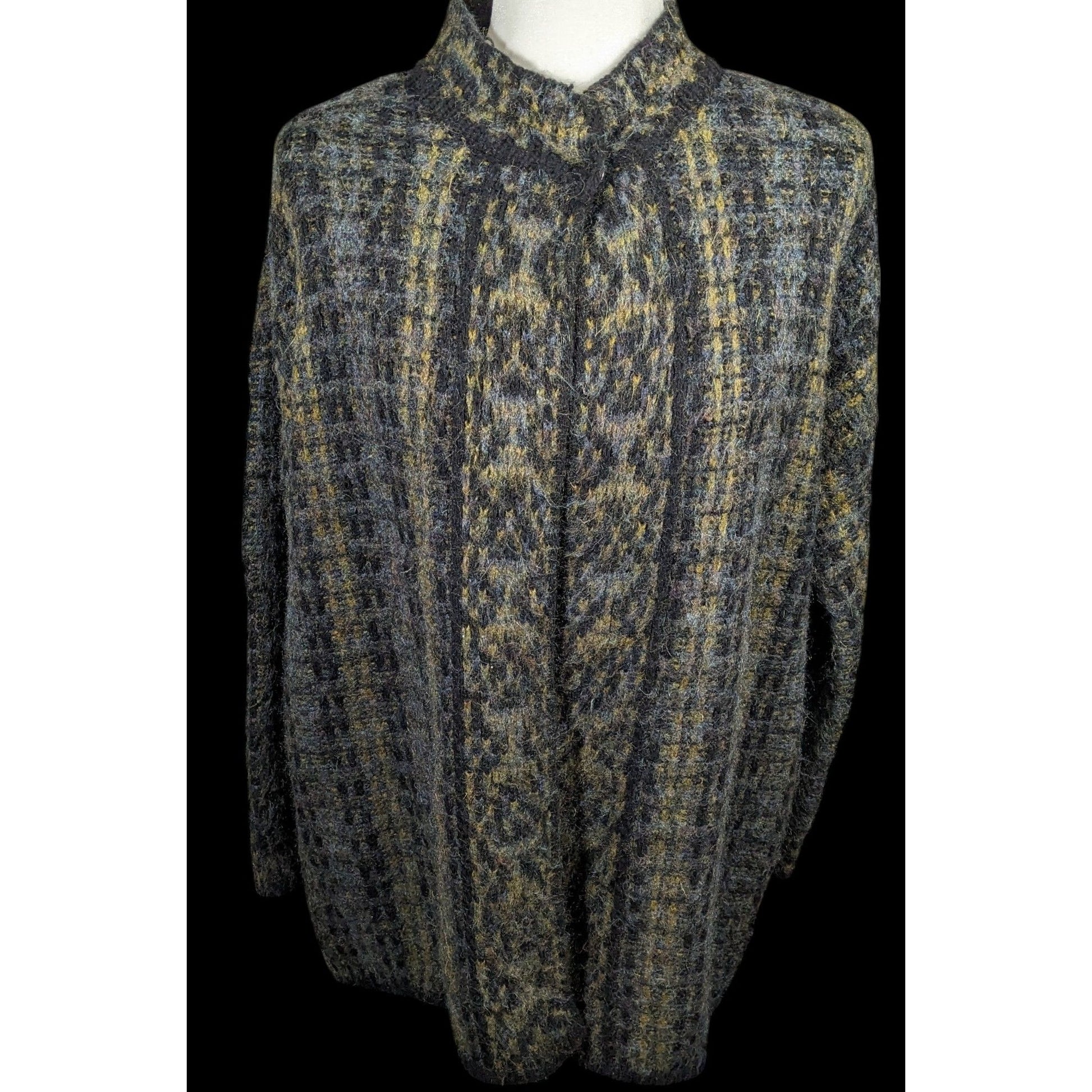 Cozy vintage Italian cardigan made from soft alpaca and mohair blend. Earth tones create a warm and inviting look. Perfect for layering on cool days, this large size cardigan offers comfort and timeless style.