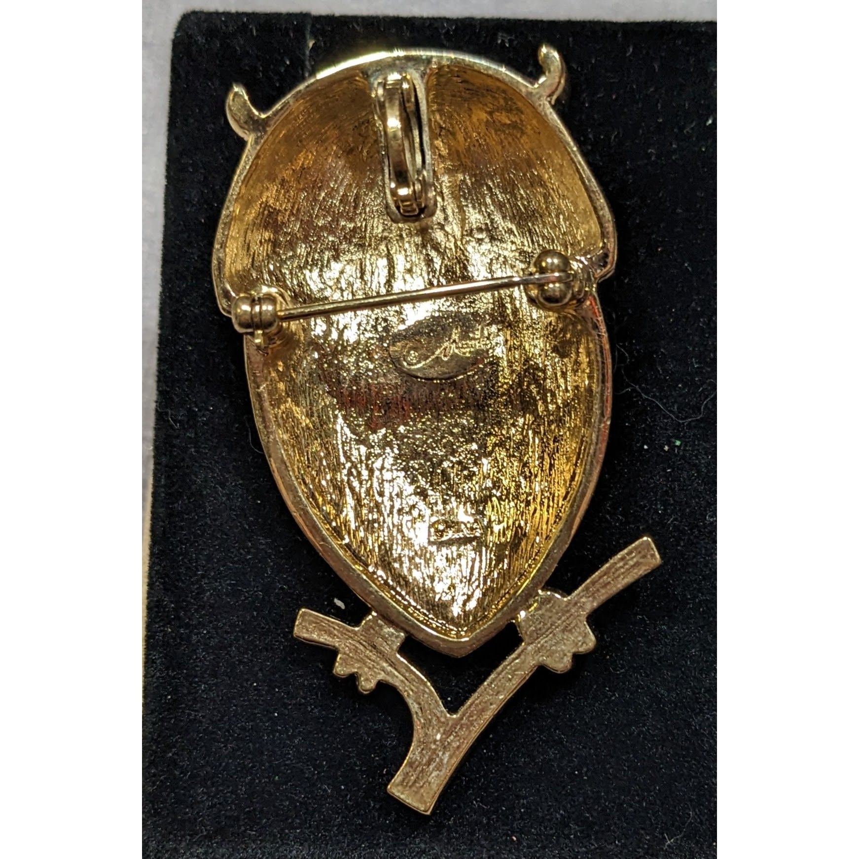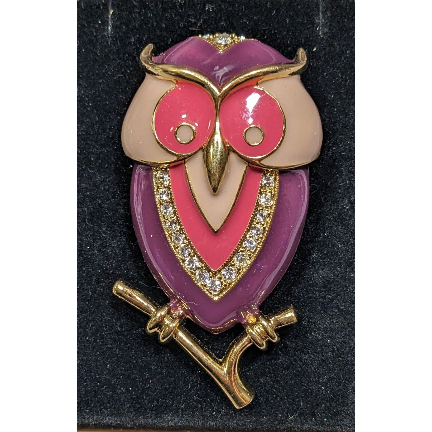 This whimsical owl brooch showcases a vibrant pink and purple design with crystal accents, perfect for adding a touch of vintage charm to any outfit. Its intricate details and playful colors make it a delightful accessory for various occasions.