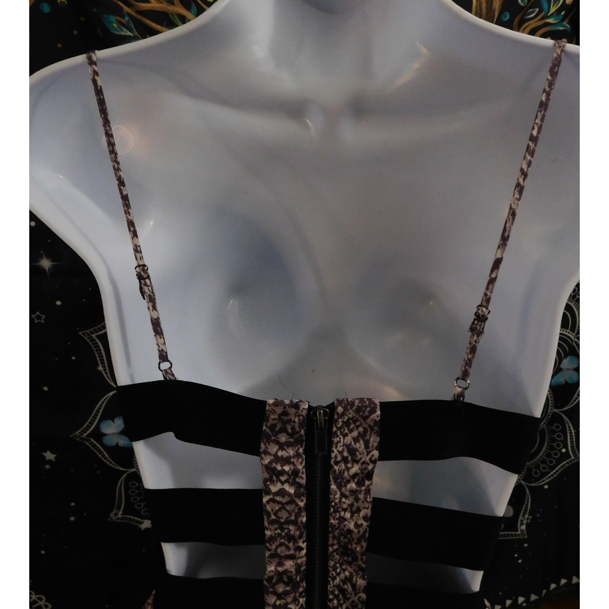 Cute and fun snake print party dress by Material Girl. It's brand new with tags. It's in a purple and white snake print material that the tag refers to as "seafog snake print". It has plastic boning in the front and sides to help keep its shape. (4 pieces total. It has a slightly gathered waist, and an a-line skirt. It has adjustable spaghetti straps. It has a zipper back closure. The back has snake print fabric in the middle around the zipper, and the rest of the back has an alternating pattern of thick elastic strips, and decorative gaps. The strips are about 1 1/2 inches, and the gaps between are about 1 1/4 inches. There are 3 strips and 2 gaps total.