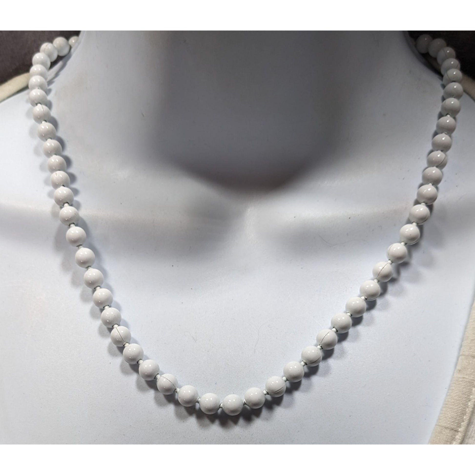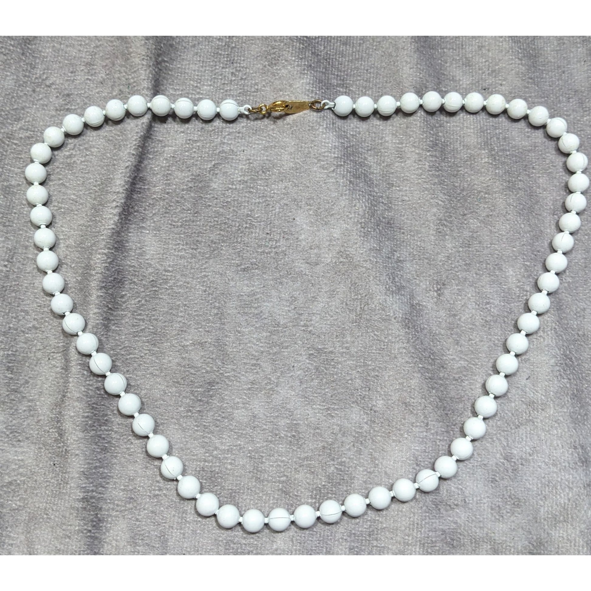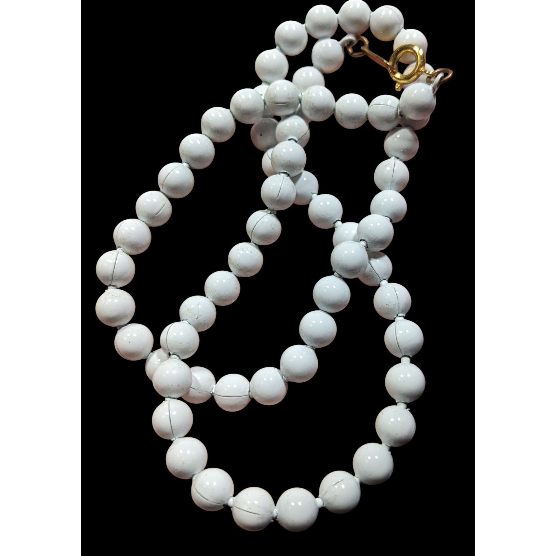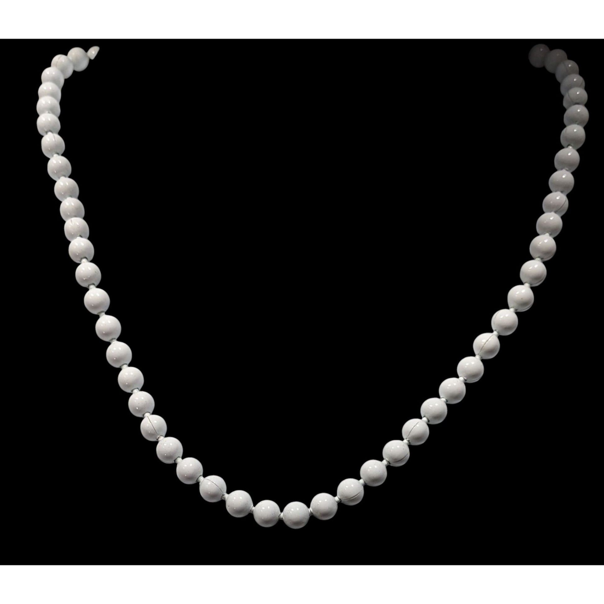 In the soft whispers of memory, this necklace tells a tale of timeless elegance. Each pristine white metal bead, carefully threaded and connected by delicate seams, carries the weight of unspoken stories. The golden clasp gleams like a promise, holding together a narrative of craftsmanship and quiet sophistication that transcends fleeting trends. These pearls of ceramic speak of refined moments, of graceful gatherings where subtle beauty reigns supreme.