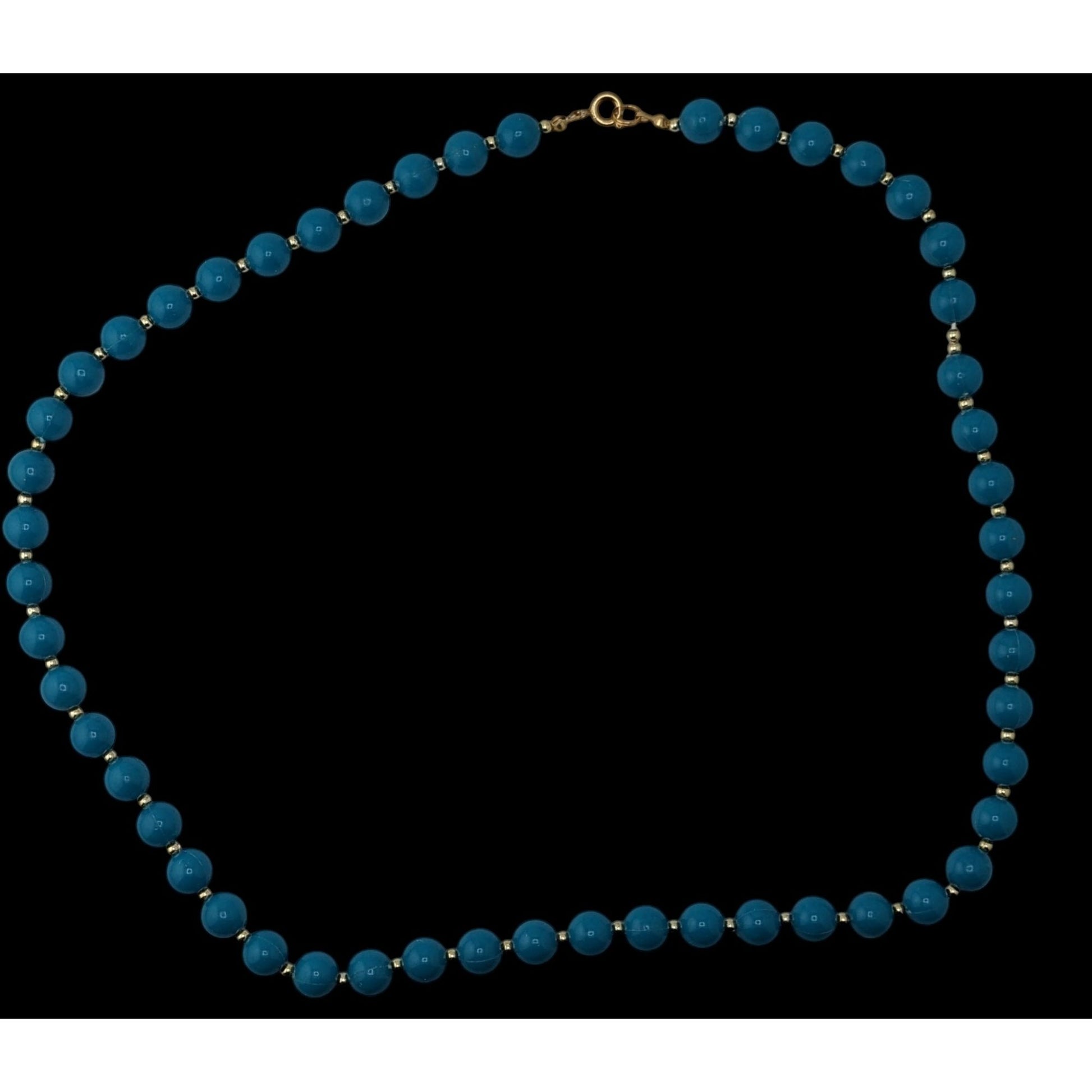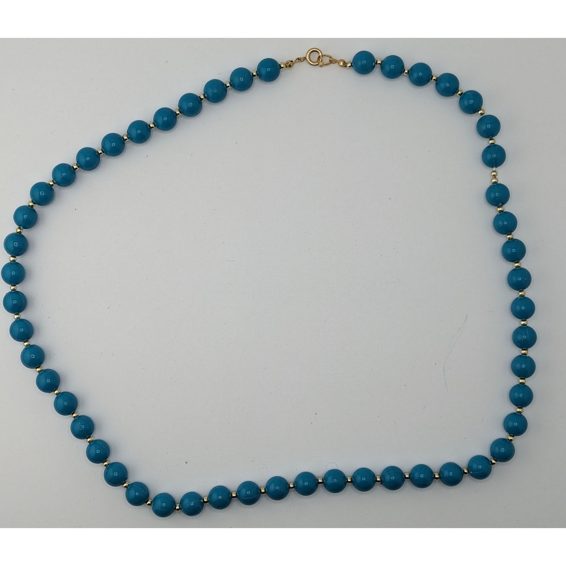 The vintage 24-inch blue bead necklace exudes retro charm with its vibrant beads and gold-tone accents. A timeless accessory that tells a story of elegance and nostalgia, perfect for making a bold statement. Its classic length drapes beautifully, complementing various styles, from casual to formal.