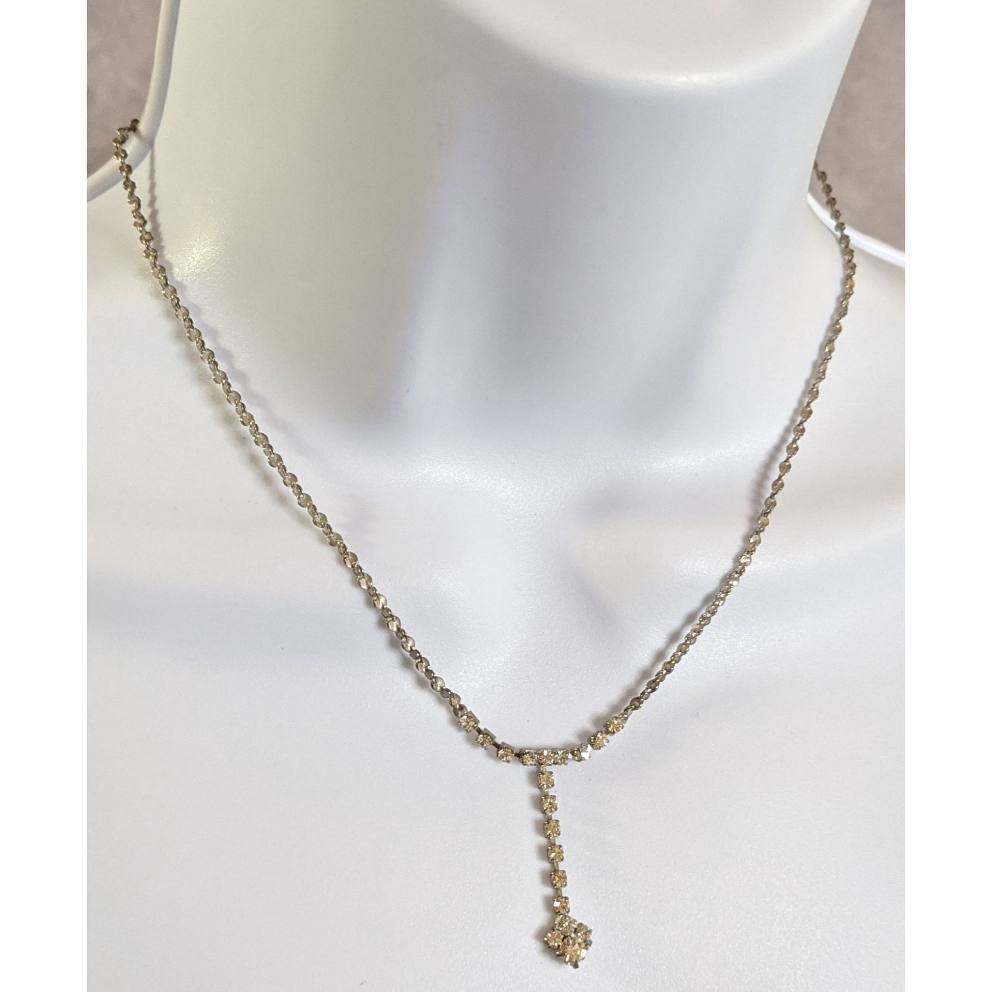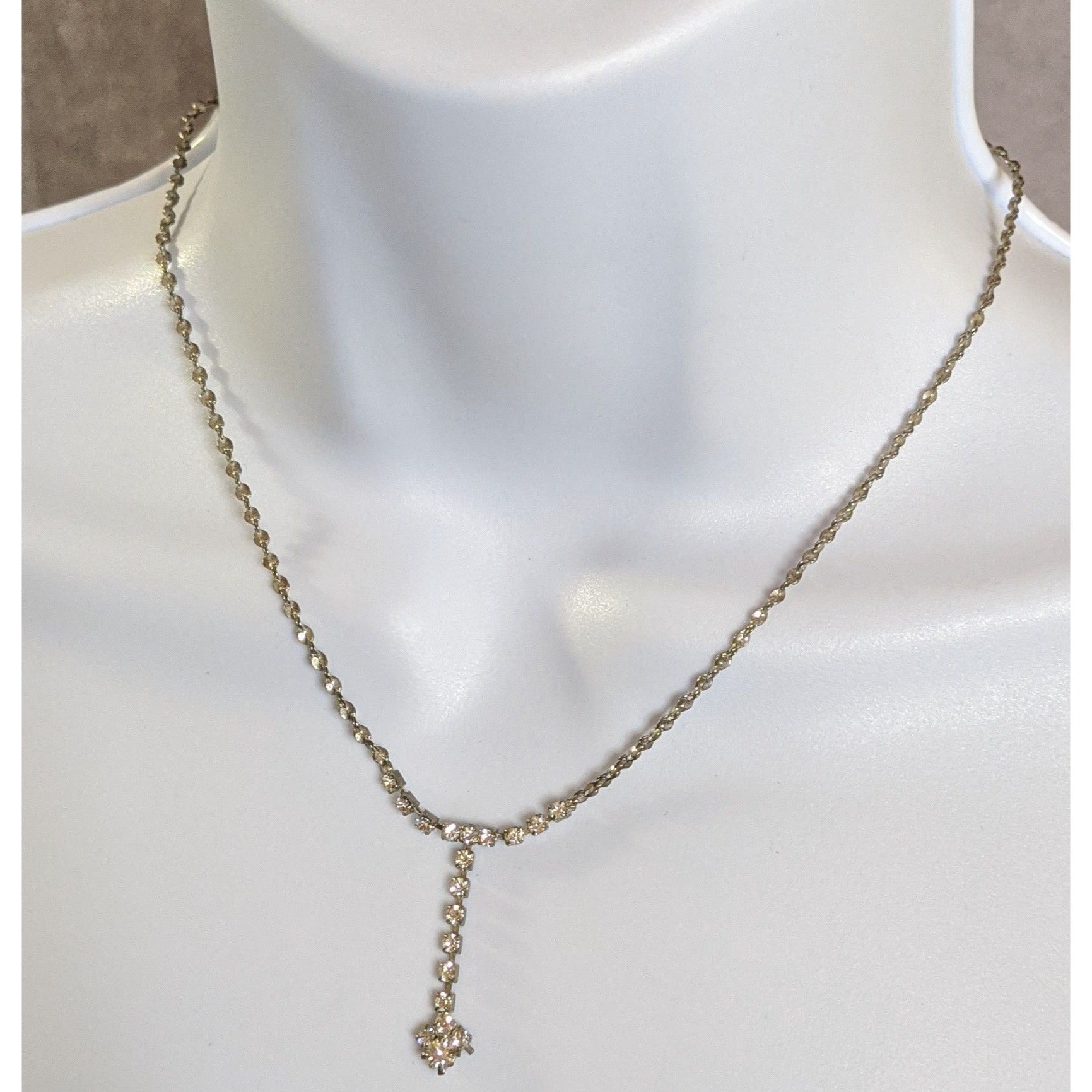 This vintage rhinestone Y necklace exudes timeless charm. Its 16-inch silver-tone chain highlights a delicate drop pendant, adorned with sparkling rhinestones, reminiscent of classic elegance. Perfectly suited for adding a touch of sophistication to special events or enhancing your everyday style, this piece radiates understated beauty and grace.