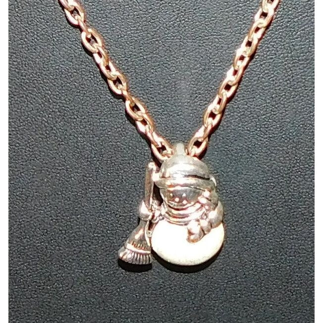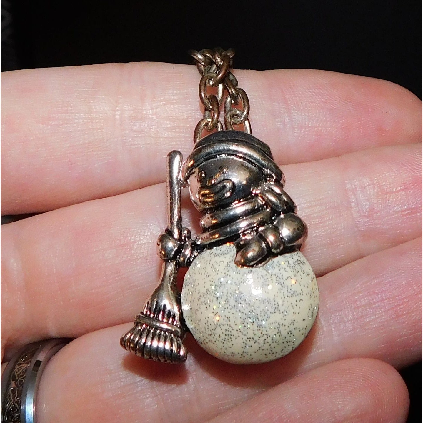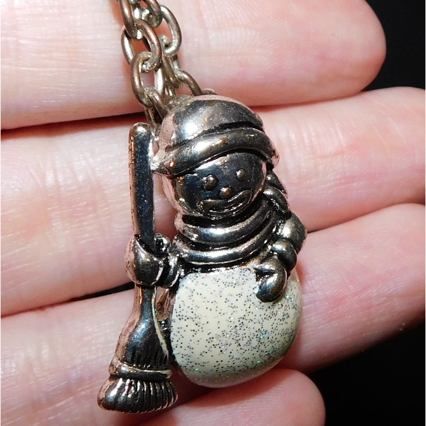 This charming vintage necklace doubles as a brooch, featuring a delightful snowman design with sparkling silver glitter. Perfect for adding a festive touch to any outfit or gift for a loved one.