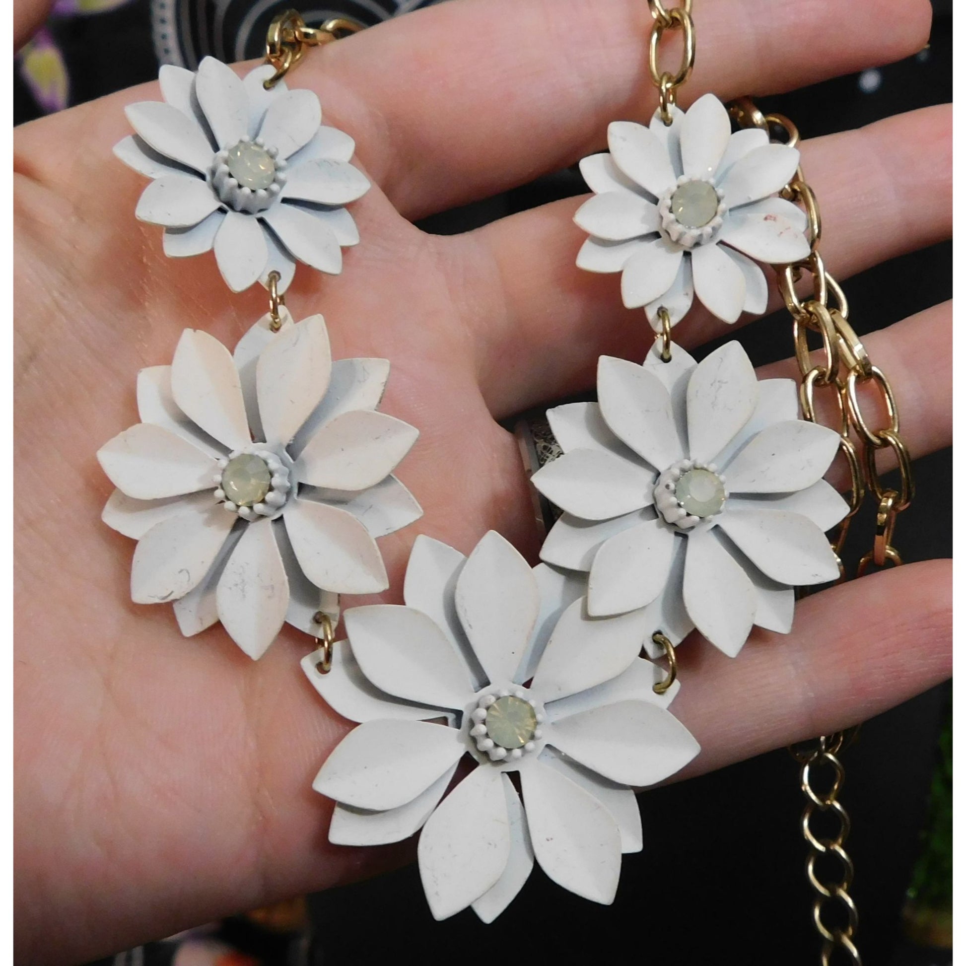 This vintage holiday necklace features a delicate white poinsettia design, perfect for adding a festive touch to any outfit. Its timeless charm makes it an ideal accessory for seasonal celebrations or as a thoughtful gift.