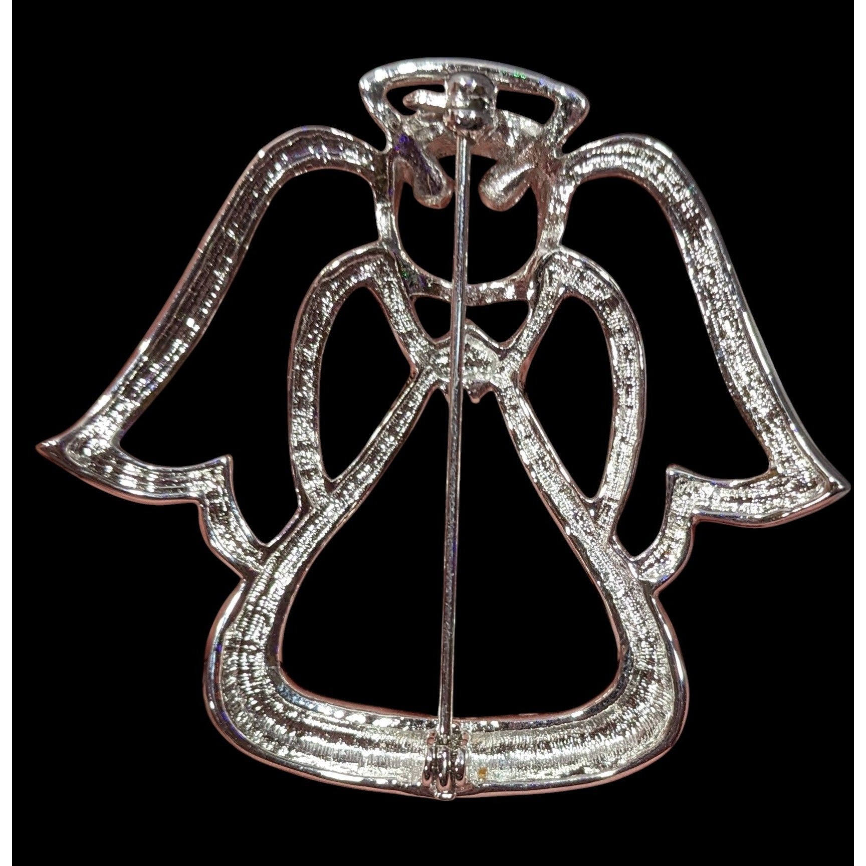 This whimsical bright silver tone angel brooch features rhinestone eyes, offering a touch of elegance and charm to any outfit. Perfect for collectors or as a gift, this brooch adds a playful sparkle to your accessory collection.