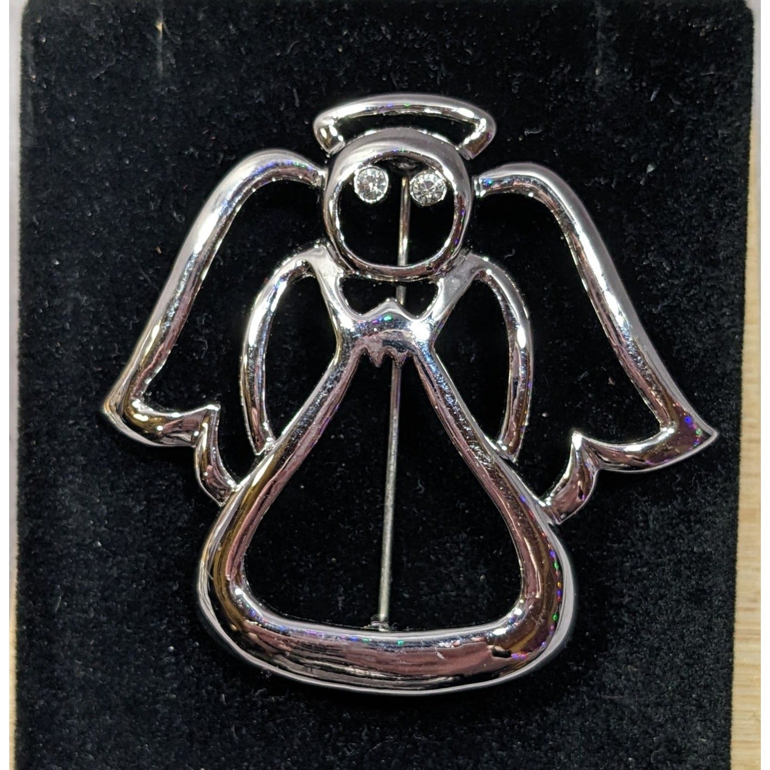 Whimsical Bright Silver Tone Angel Brooch With Rhinestone Eyes