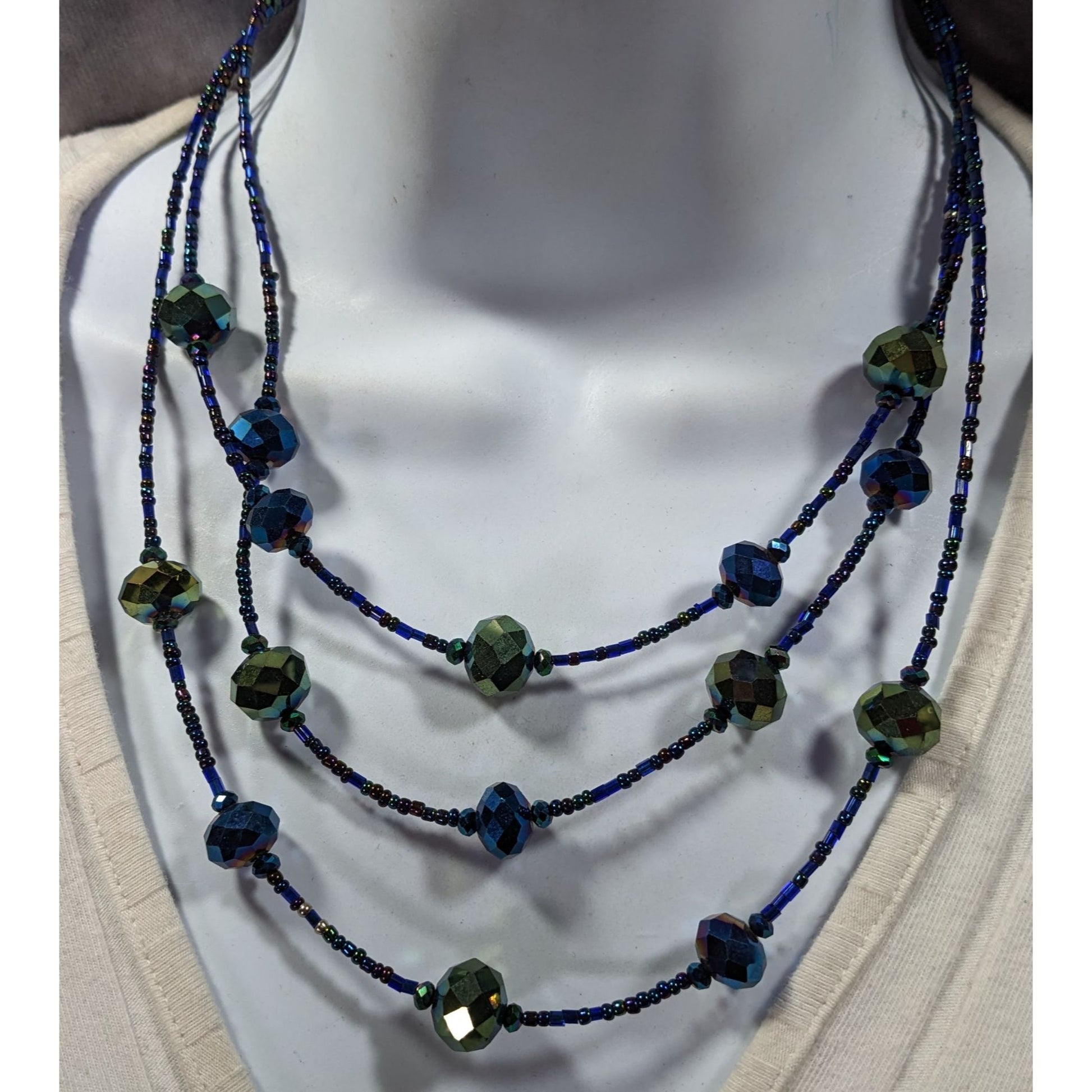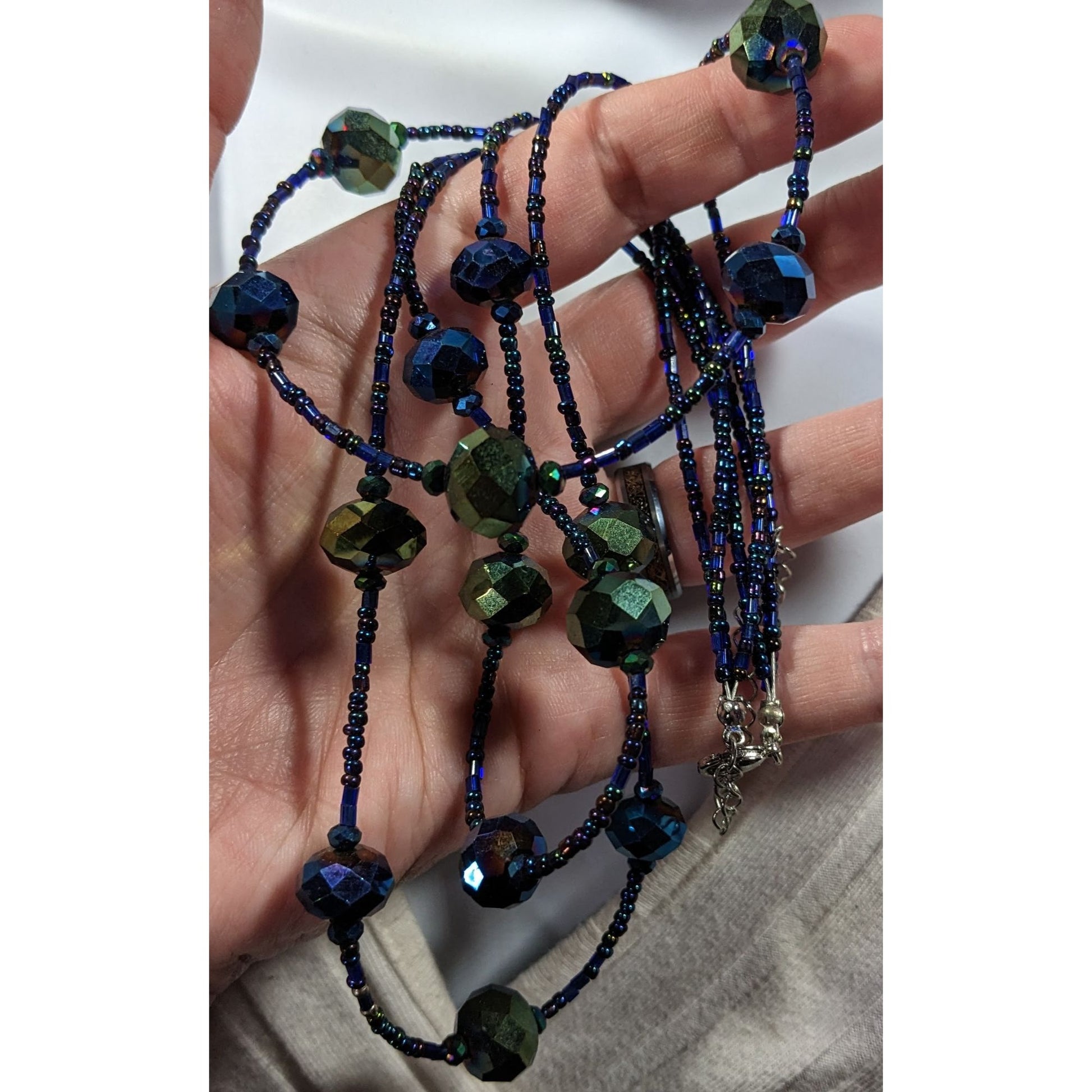 Add a touch of whimsy to your look with this stunning blue and green oil slick glass beaded necklace. Perfect for fantasy lovers, its vibrant colors and unique design make it a standout accessory. Ideal for any occasion, it adds a magical flair to your ensemble.