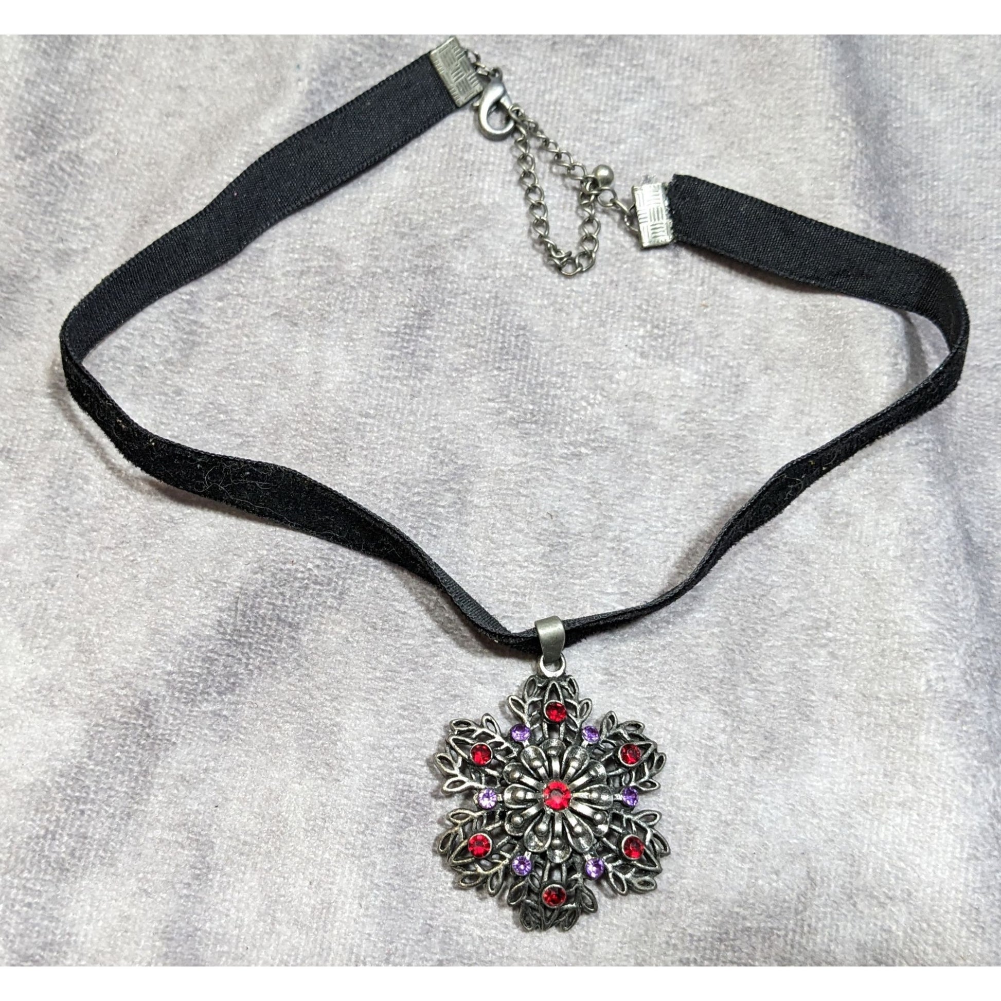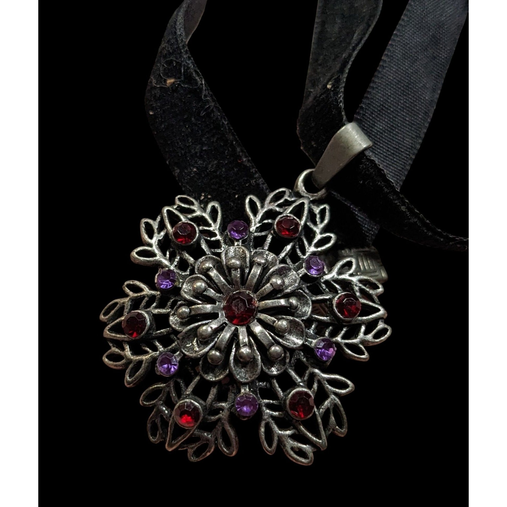 Elevate your style with this whimsical Whimsygoth floral pendant necklace. Featuring vibrant rhinestones and intricate beadwork, this unique piece adds a touch of magic to any outfit. Perfect for special occasions or everyday wear.