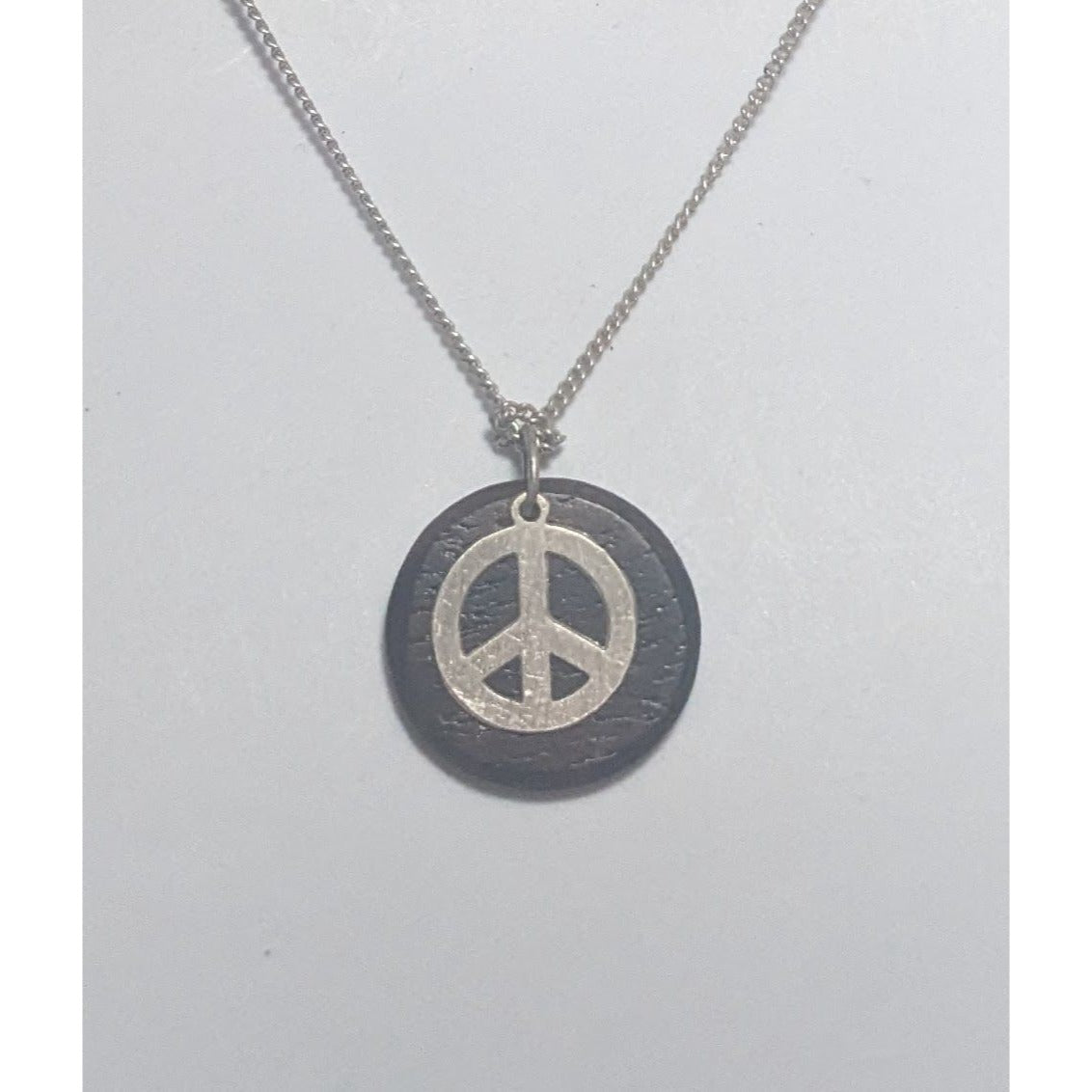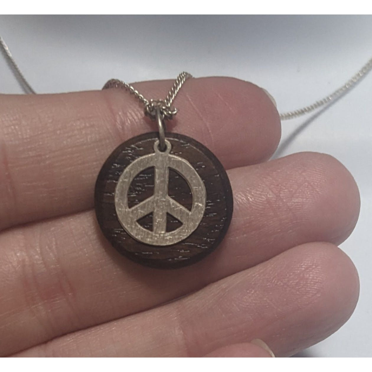 Fun retro style wood peace charm necklace. It's on a bright silver tone chain with a spring clasp closure. It has a polished wooden disc charm, with a small silver tone peace sign charm that sits over the top of it. Perfect for hippie and Bohemian looks! Fun 70s vibes.
